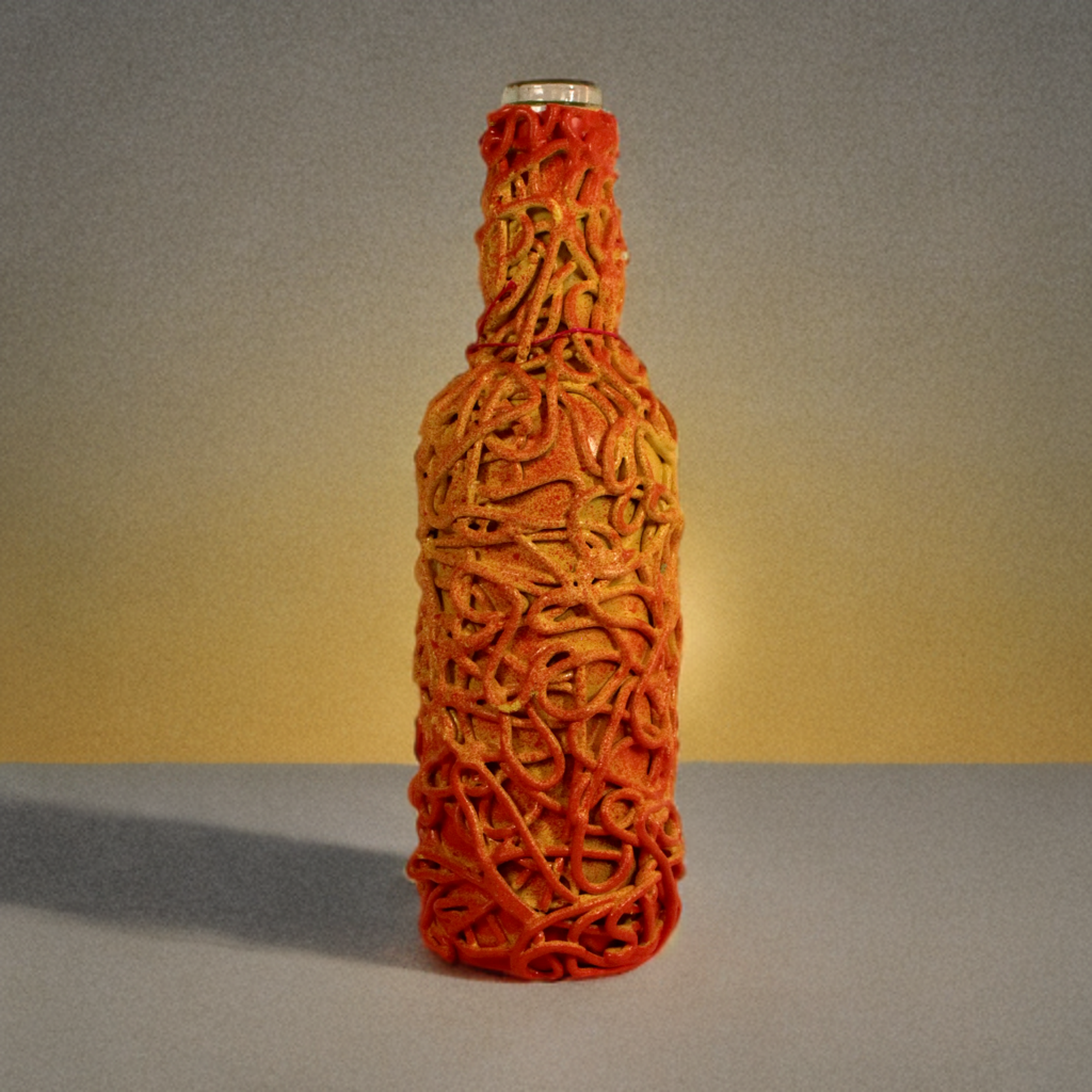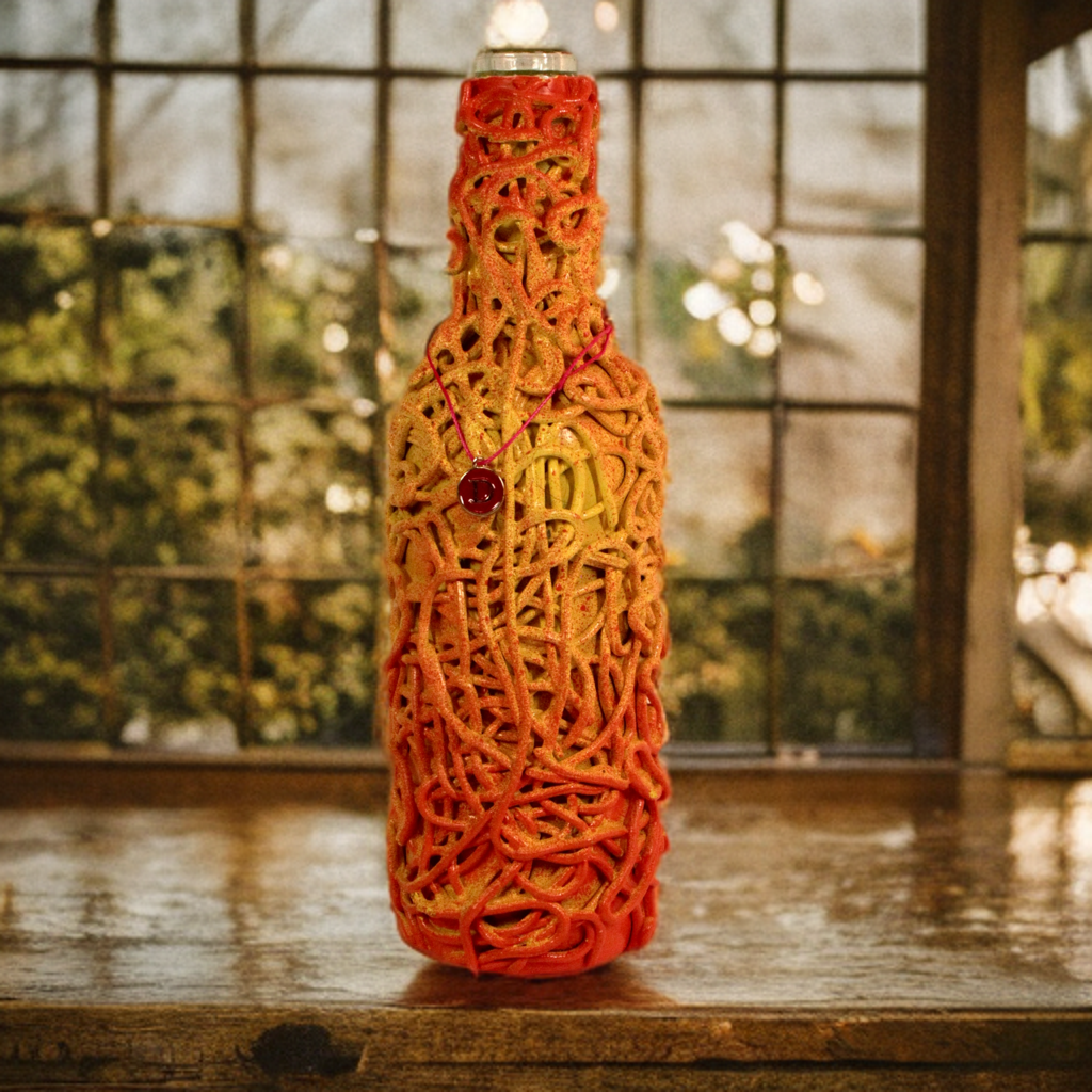 The signature design of Davide Dimora defines this handcrafted decorative bottle, part of the exclusive 2025 collection, which features fewer than 10 extremely rare models. The vibrant gradient, blending warm shades of orange and yellow, gives this piece a lively yet elegant character, perfect for enhancing any living space, dining area, or artistic display.